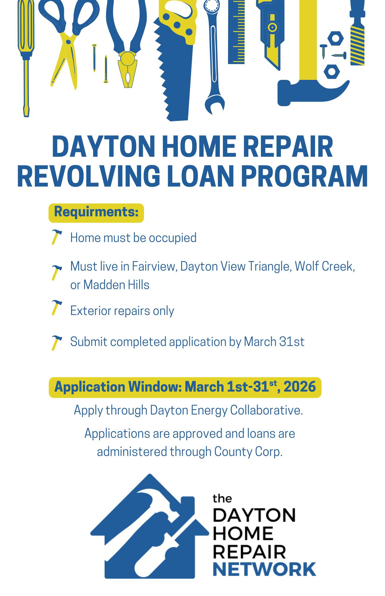 The program only addresses exterior repairs. Applicants must live in one of the 4 target neighborhoods. Dayton Energy Collaborative is supporting the program through intake and application support. County Corp will administer the actual loans and loan agreements.